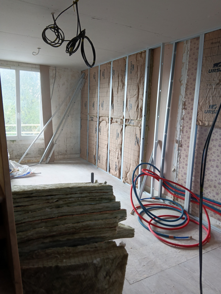 - Le suivi de travaux concernent : remplacement de 2 menuiseries extérieures, ajout d'une fenêtre de toit, plâtrerie (maison initialement non isolée), électricité et plomberie refaites à neuf, carrelage - faïence, sols stratifiés, cuisine et poêle à bois (avec tubage et réfection cheminée)
